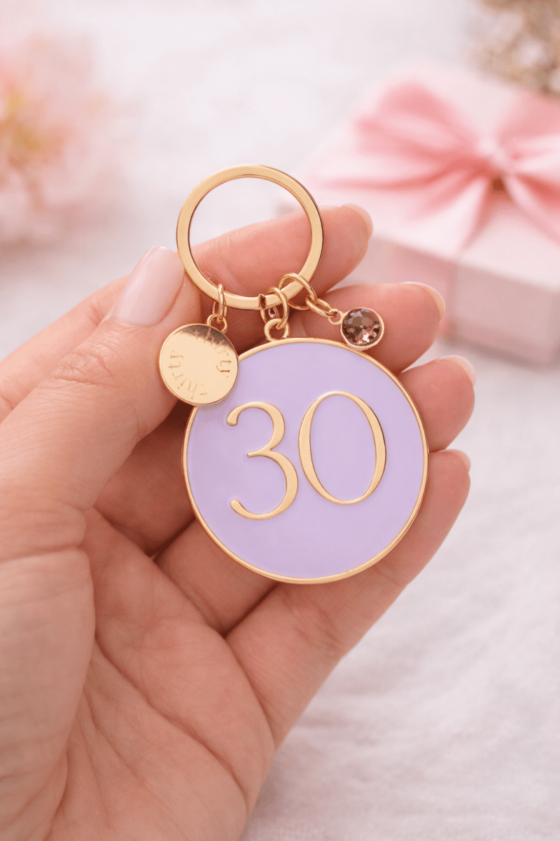 Mark those unforgettable birthdays and anniversaries with our elegant milestone keyring collection. Each beautifully crafted keyring features a bold enamel number disc in soft pastel shades, finished with luxurious gold-tone detailing and a sparkling crystal charm.