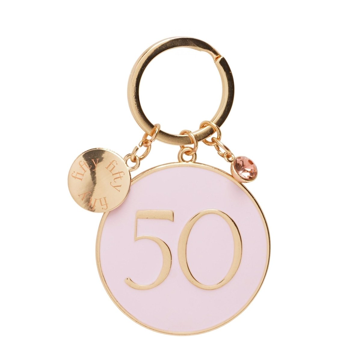 Every keyring showcases a large circular enamel disc displaying milestone ages or anniversary years (21, 30, 40, 50, 60, or 70) in gleaming gold numerals. The design is completed with a delicate branded charm disc and a coordinating crystal accent, creating a gift that's both meaningful and stylish.