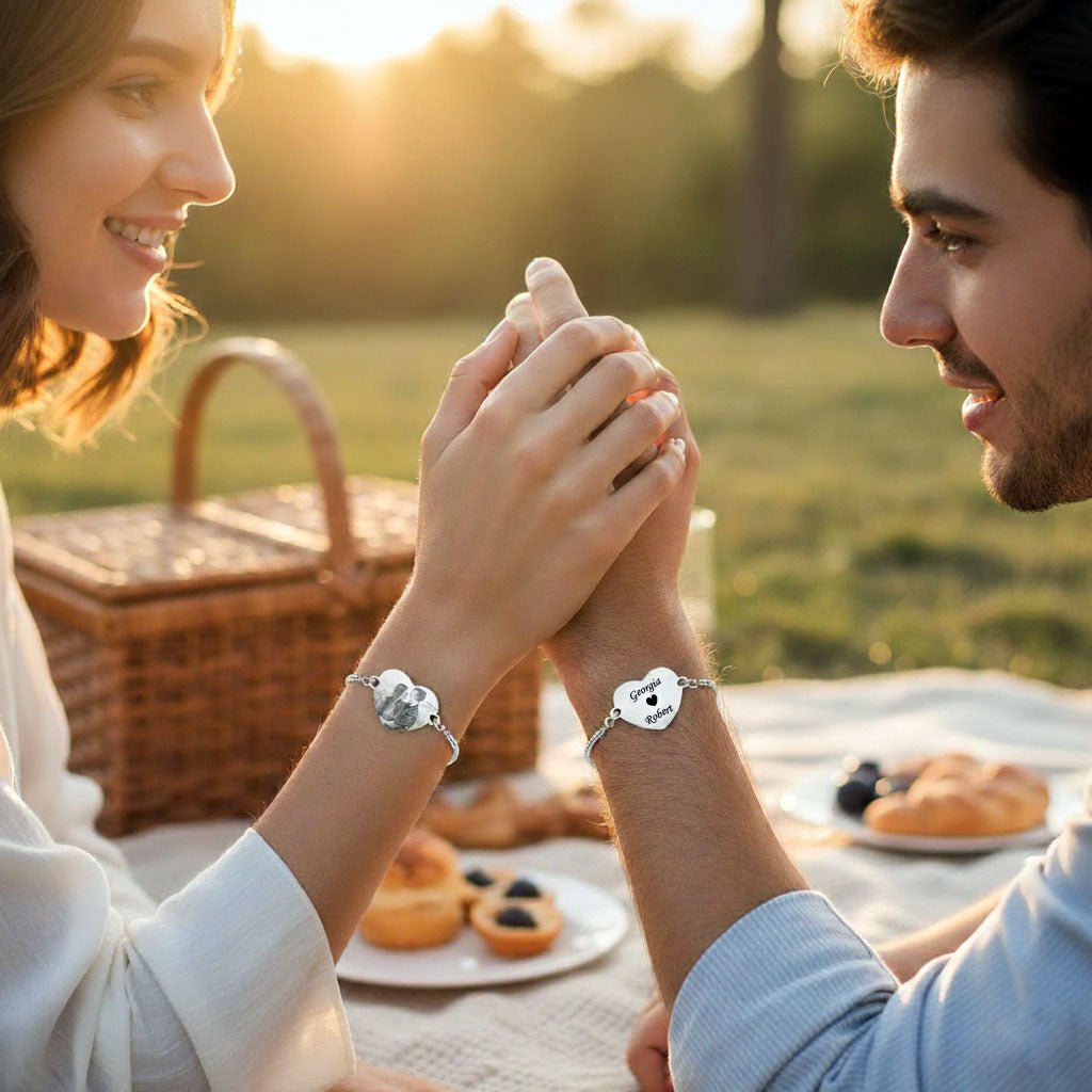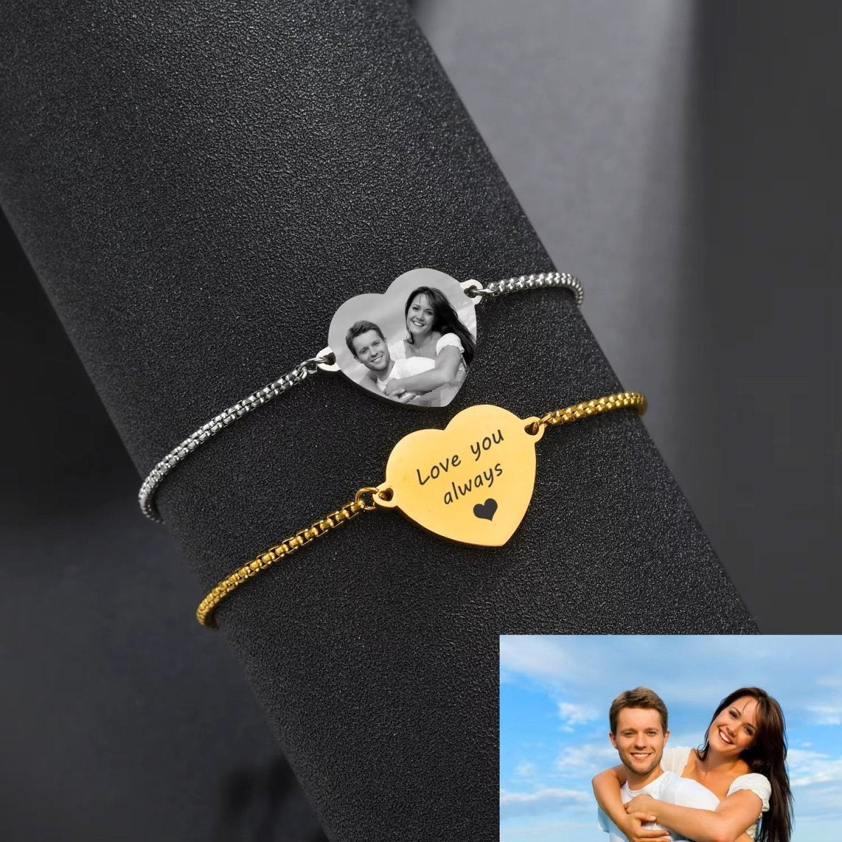 Personalised Bracelet Set – Heart Shaped Photo Engraved Couples Bracelets, Adjustable Stainless Steel