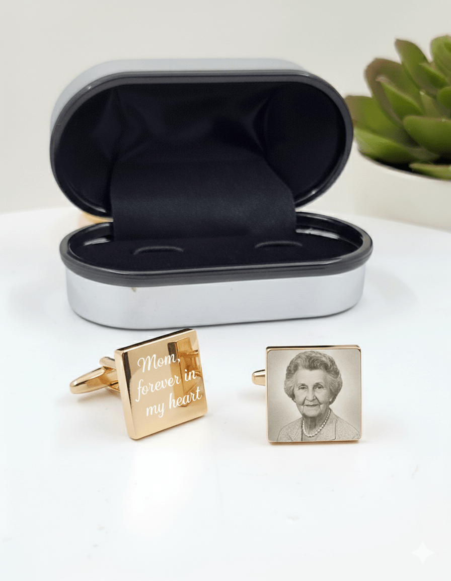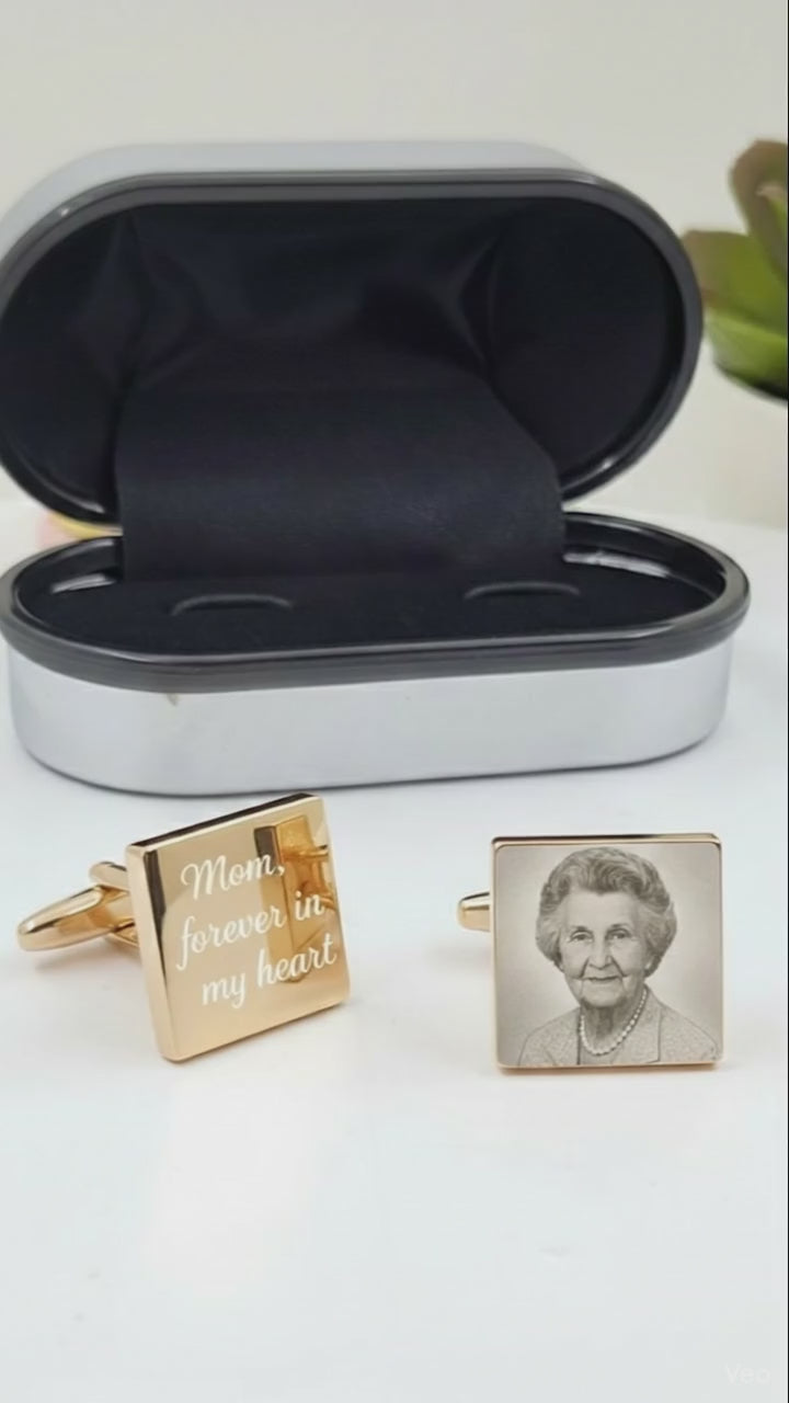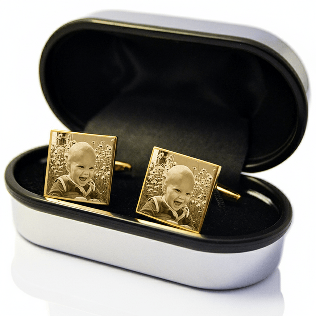 Personalised Square Gold Cufflinks – Photo Engraved in Chrome Case