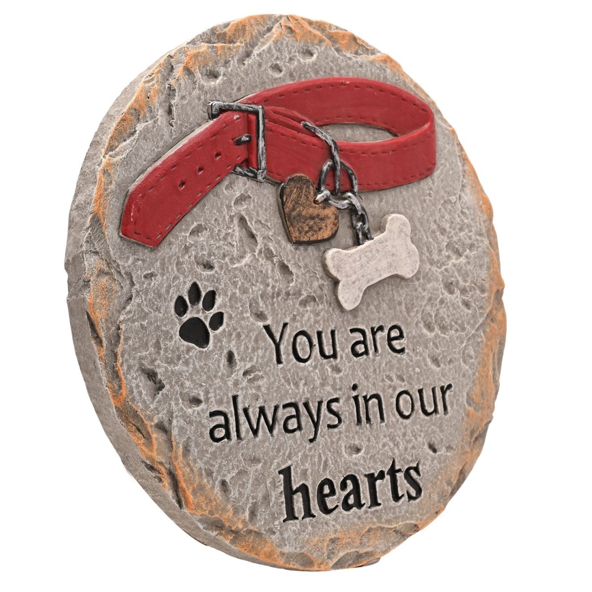 The memorial includes a charming red collar with heart and bone tags that can be personalised with your chosen text. The fixed inscription "You are always in our hearts" serves as a permanent reminder of the unconditional love pets bring to our lives.