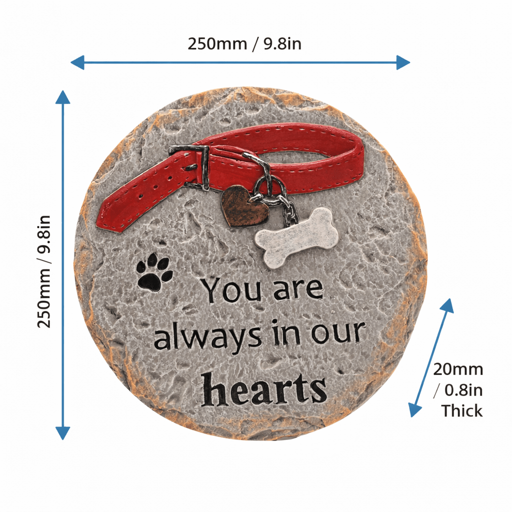 This beautiful pet memorial stone offers a heartfelt way to honour the memory of your cherished pet. Crafted from durable cement with a natural stone finish, it features the touching sentiment "You are always in our hearts" alongside a delicate paw print design.