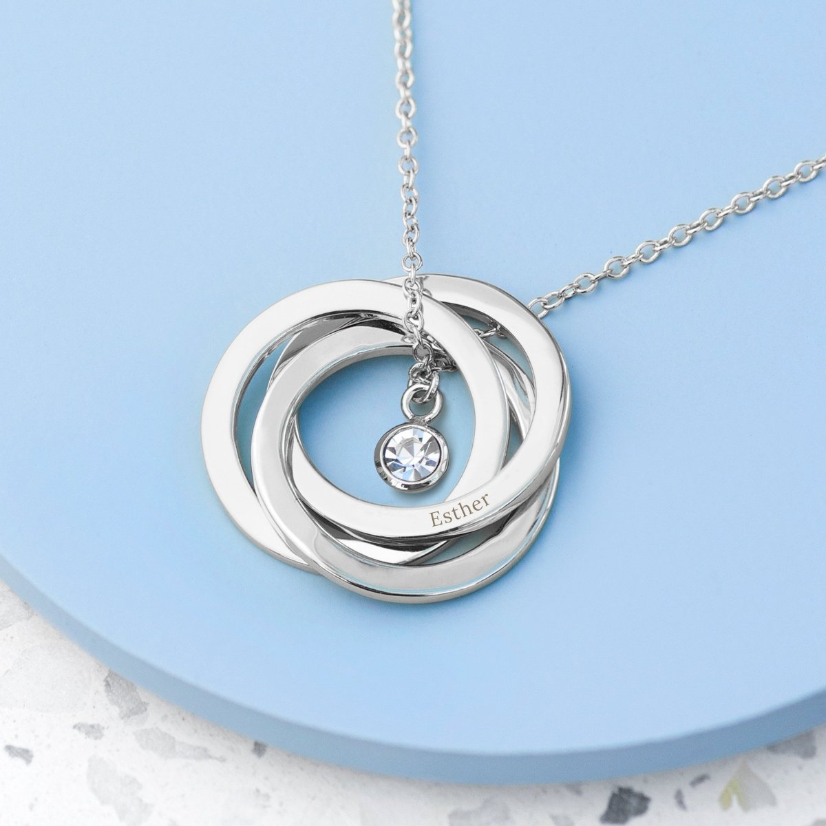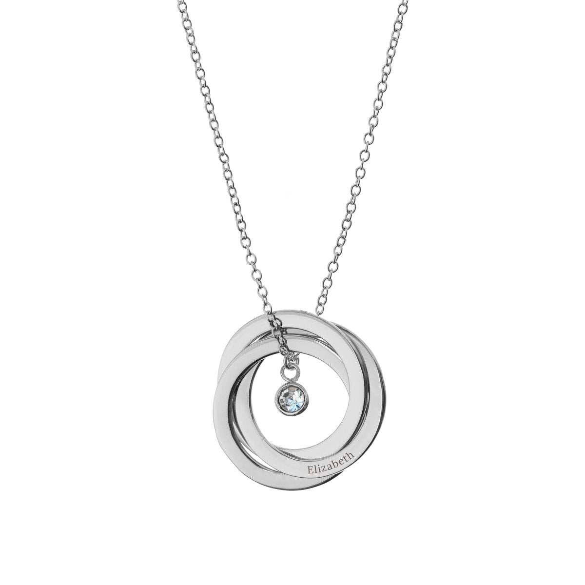 Representing a couple’s (or any loving bond’s) past, present and future, our gorgeous Personalised Russian Ring Crystal Necklace is sure to take her breath away. This standout piece of jewellery will quickly become a staple of her wardrobe, helped by the fact it complements both formal and casualwear.