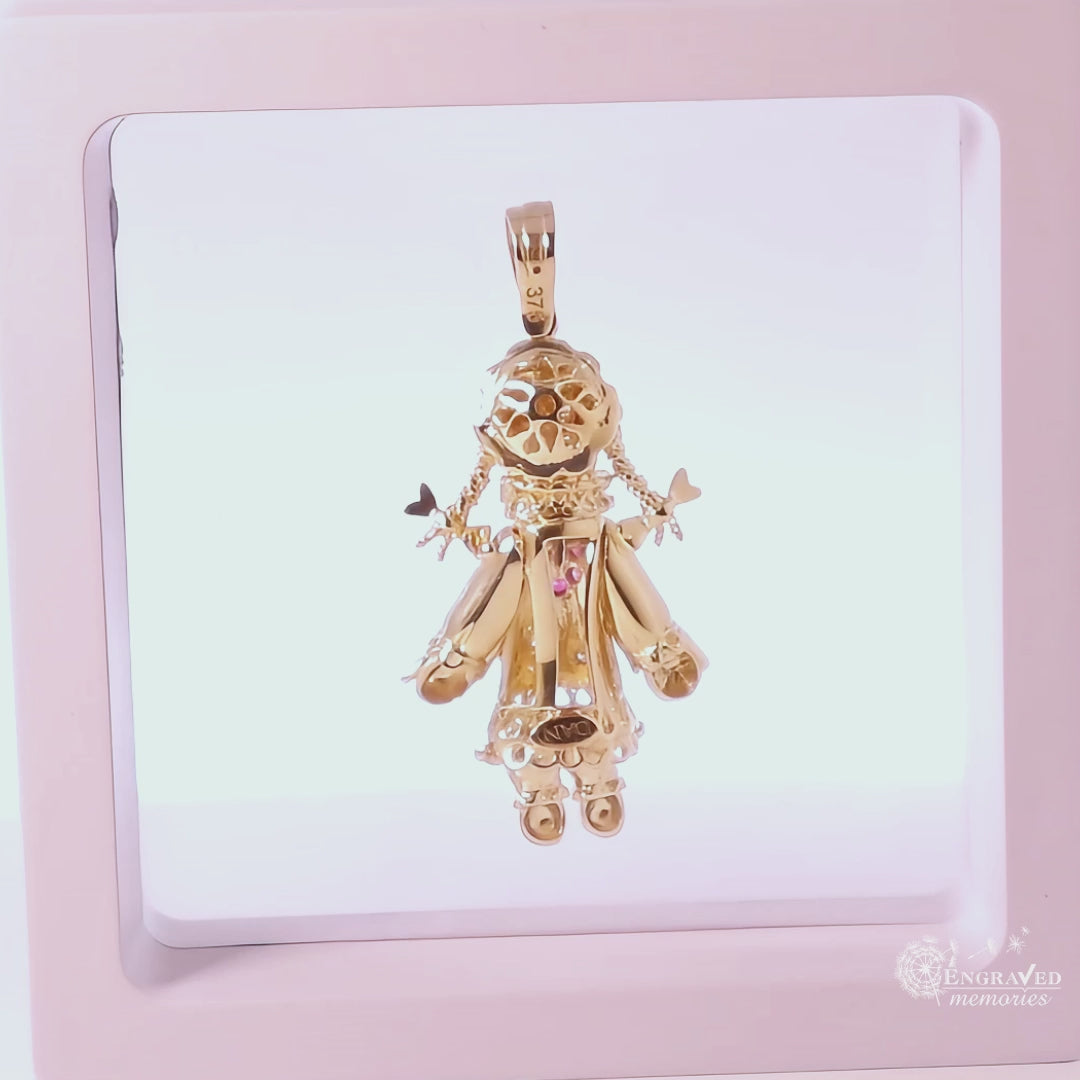 This exquisite 9ct yellow gold articulated ragdoll pendant is a charming and playful piece designed to capture the whimsy and joy of childhood memories. This moveable doll charm features articulated plaits, arms, and legs that create natural movement, bringing personality and life to this delightful pendant. Adorned with sparkling multicoloured CZ stone accents on the dress, this piece combines fine craftsmanship with sentimental charm.