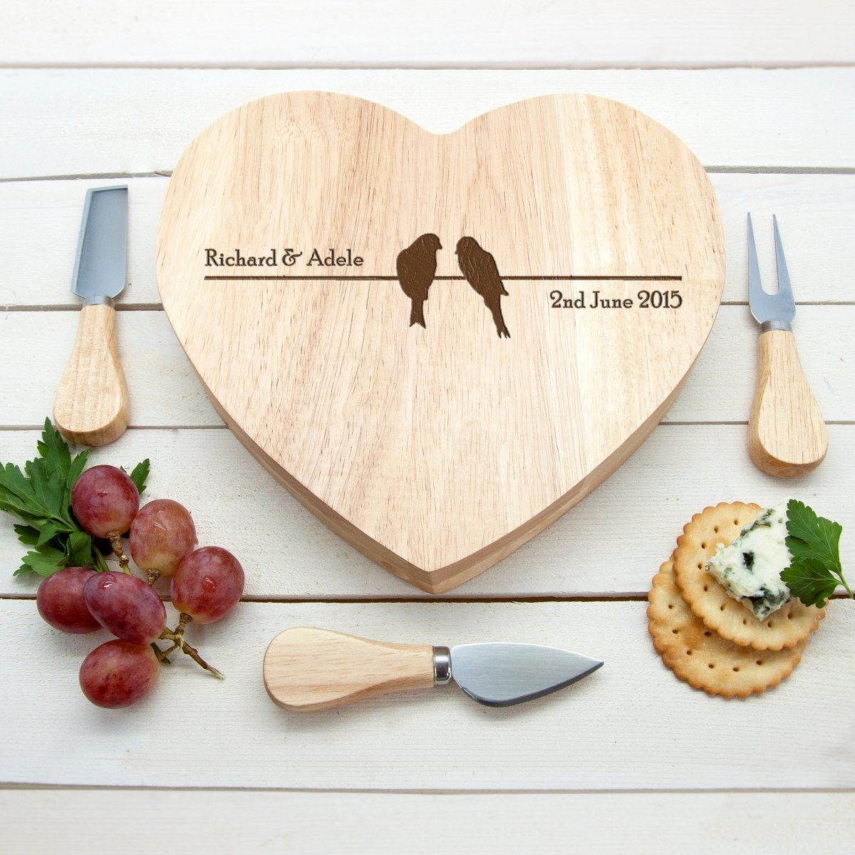 Personalised Love Birds Romantic Heart Cheese Board Set