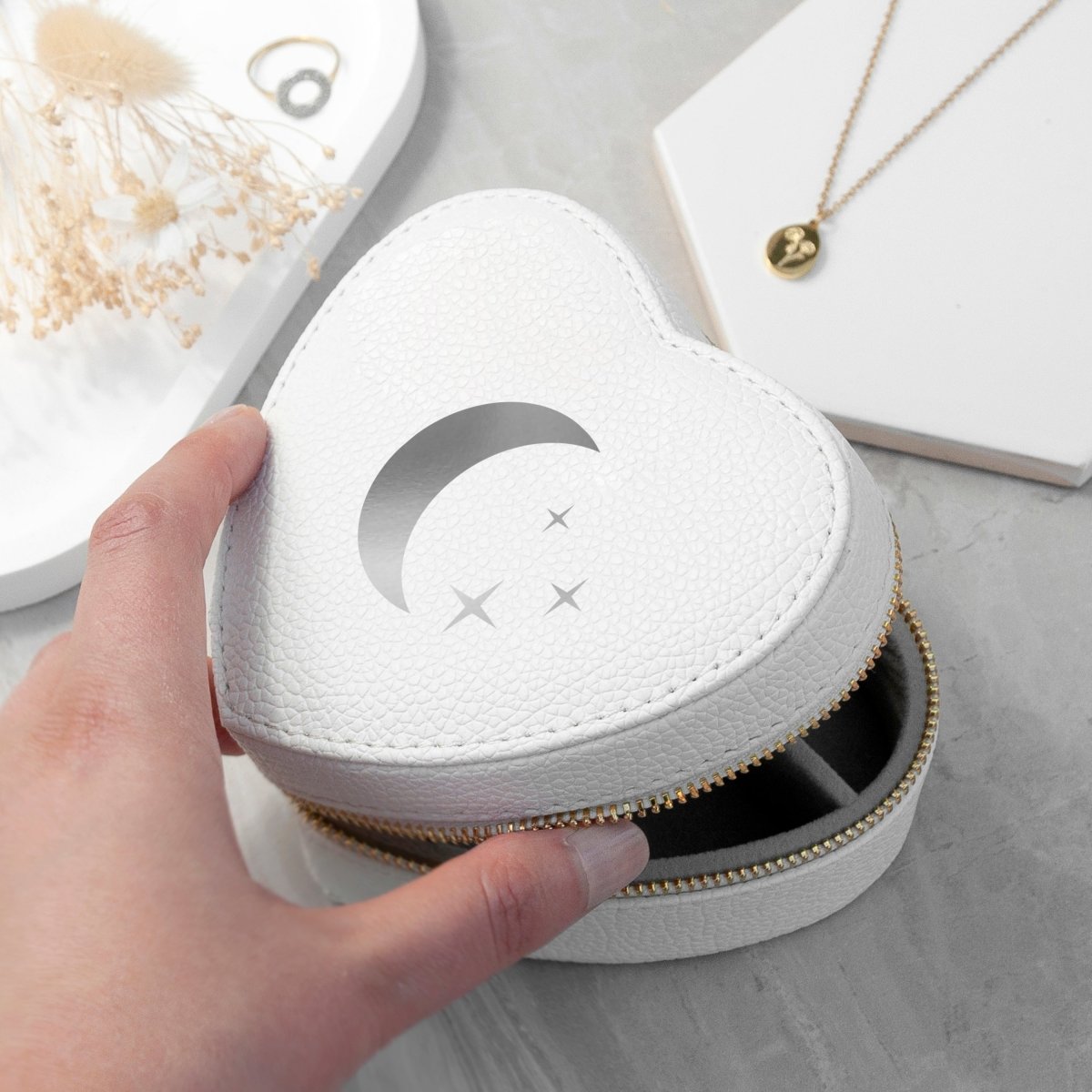 Bringing a touch of celestial elegance to your jewellery collection with our enchanting Moon and Stars White Heart Jewellery Case. This enchanting trinket case, shaped like a heart, features a delicate moon and stars design on its smooth white exterior. Both stylish and durable, this accessories holder is perfect for safeguarding your precious jewellery pieces whether at home on your bedroom dressing table or on the go.