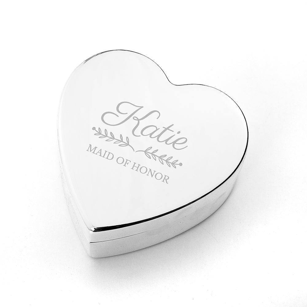 The soft felt lined box offers gentle protection for precious items, while the personalised engraving option allows you to add a name or heartfelt message, turning this jewellery storage case into a meaningful maid of honour present or flower girl keepsake. This heart shaped trinket box is perfect for gifting as a thank you bridesmaid gift, bridal shower favour, or wedding morning surprise, providing a stylish and sentimental reminder of your special day.