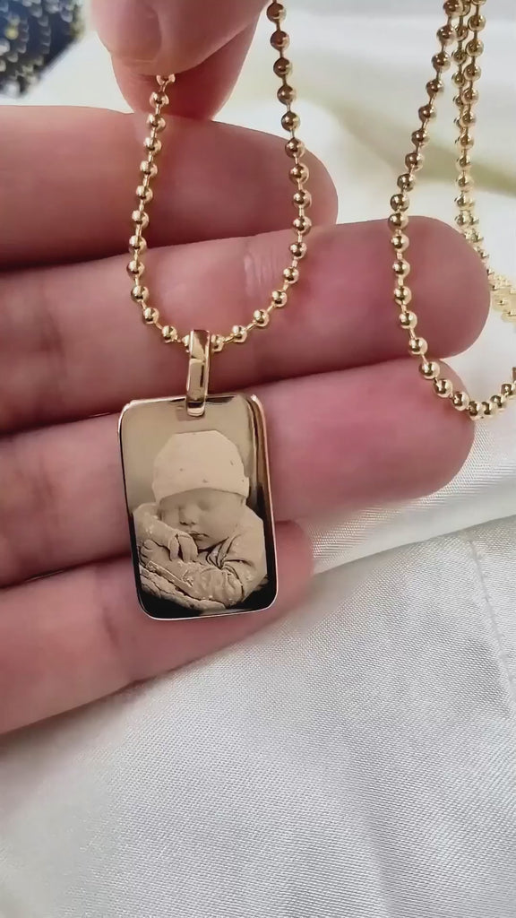 Create a truly unique keepsake with our stunning 18kt gold-plated dog tag pendant. Perfect for capturing your most cherished memories, this elegant piece combines timeless style with personal meaning.Make it personal. Make it memorable. Order your custom engraved gold dog tag necklace today.