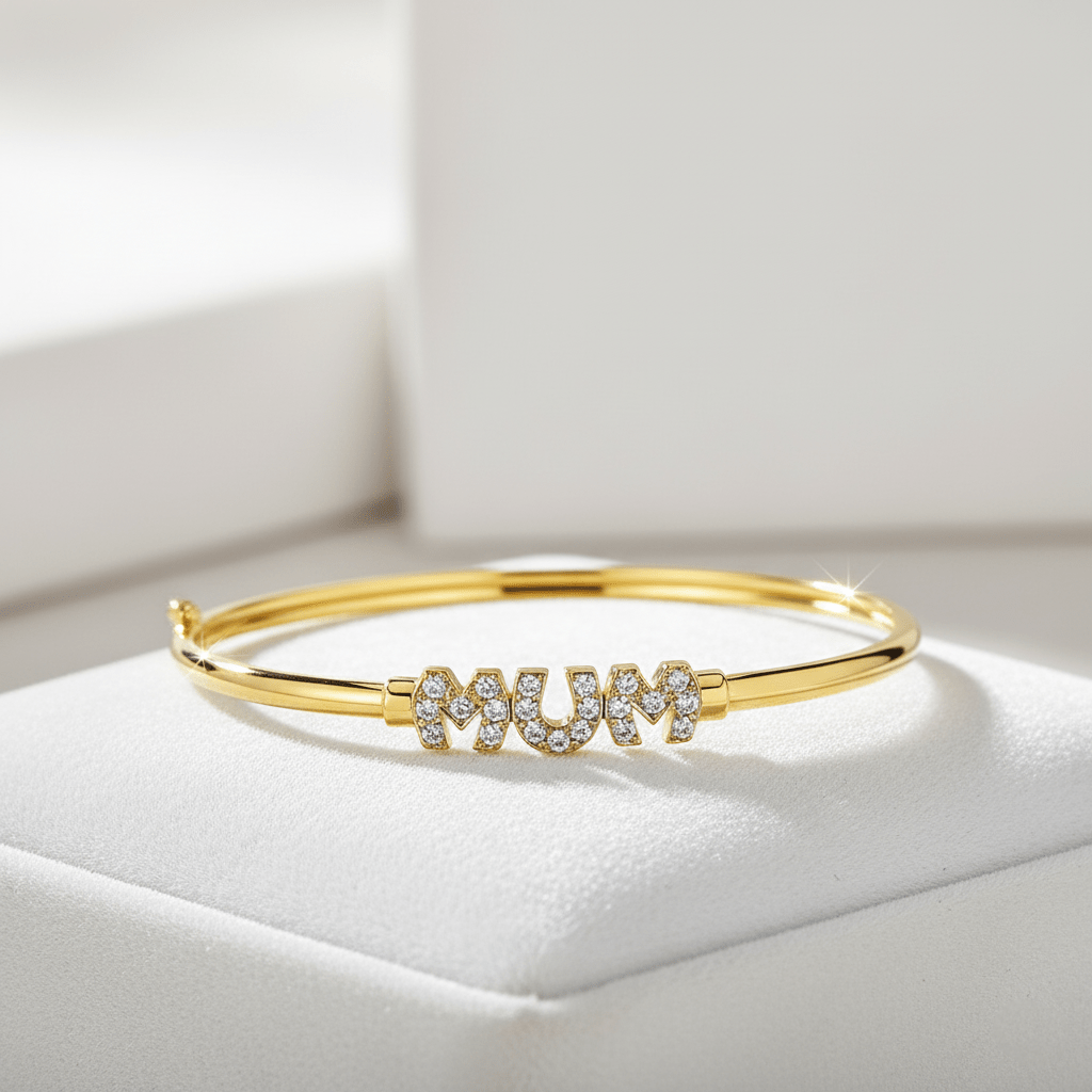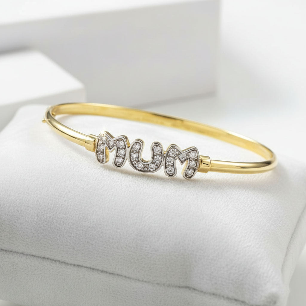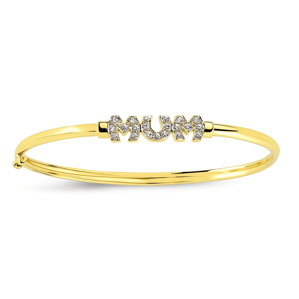 9ct Yellow Gold “MUM” Bangle with Cubic Zirconia – Elegant Hinged Bracelet Gift for Mum