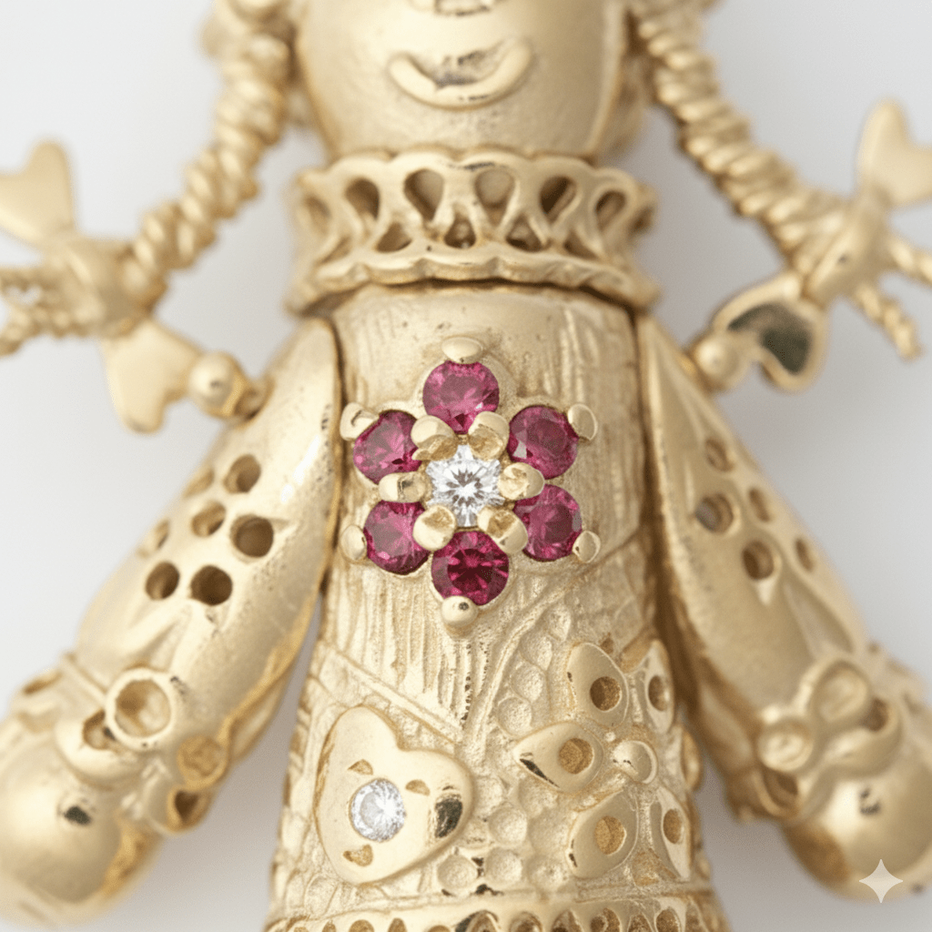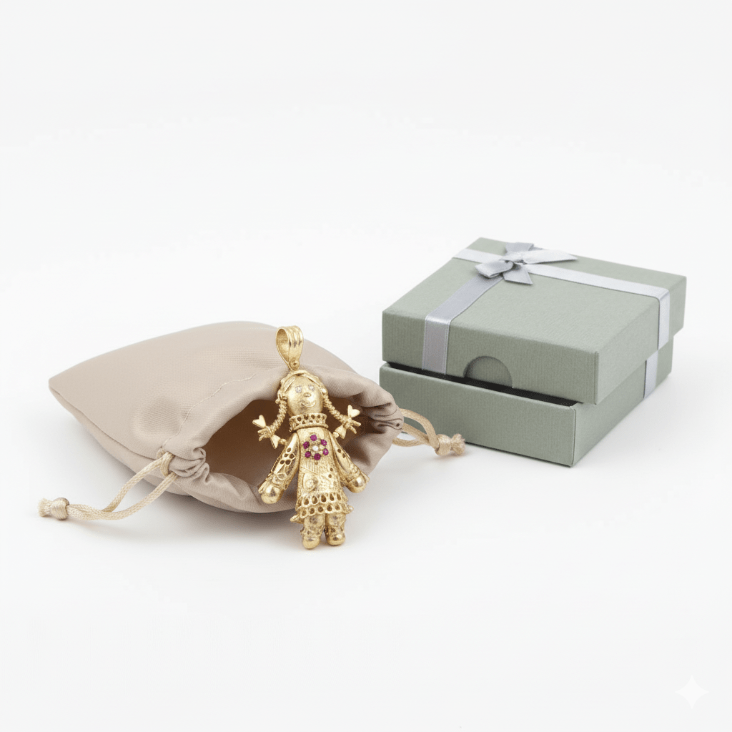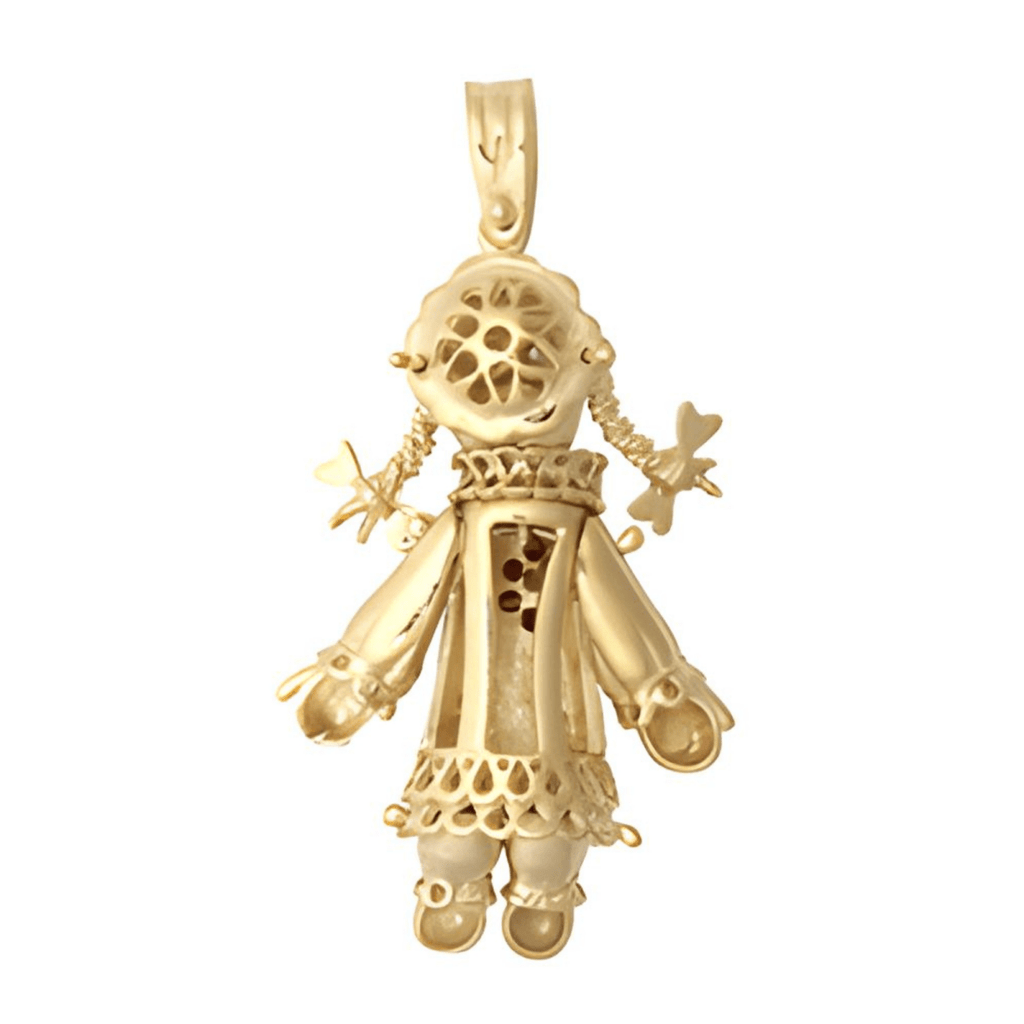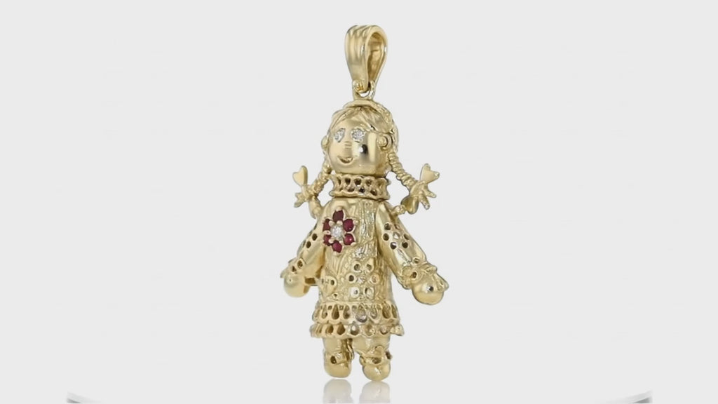This exquisite 9ct yellow gold articulated ragdoll pendant is a charming and playful piece designed to capture the whimsy and joy of childhood memories. This moveable doll charm features articulated plaits, arms, and legs that create natural movement, bringing personality and life to this delightful pendant. Adorned with sparkling multicoloured CZ stone accents on the dress, this piece combines fine craftsmanship with sentimental charm.
