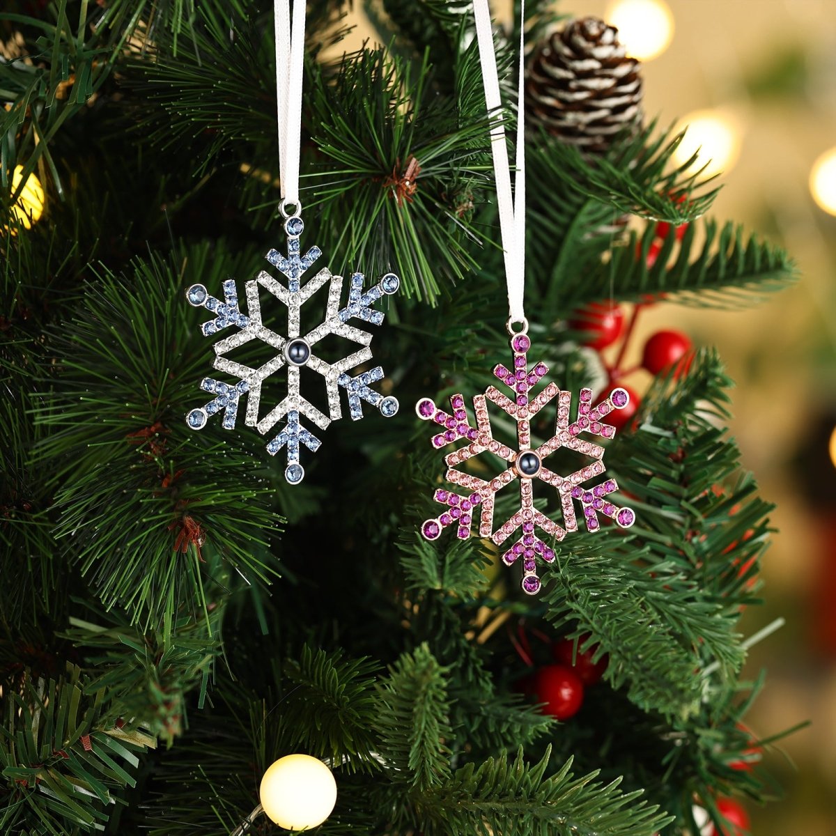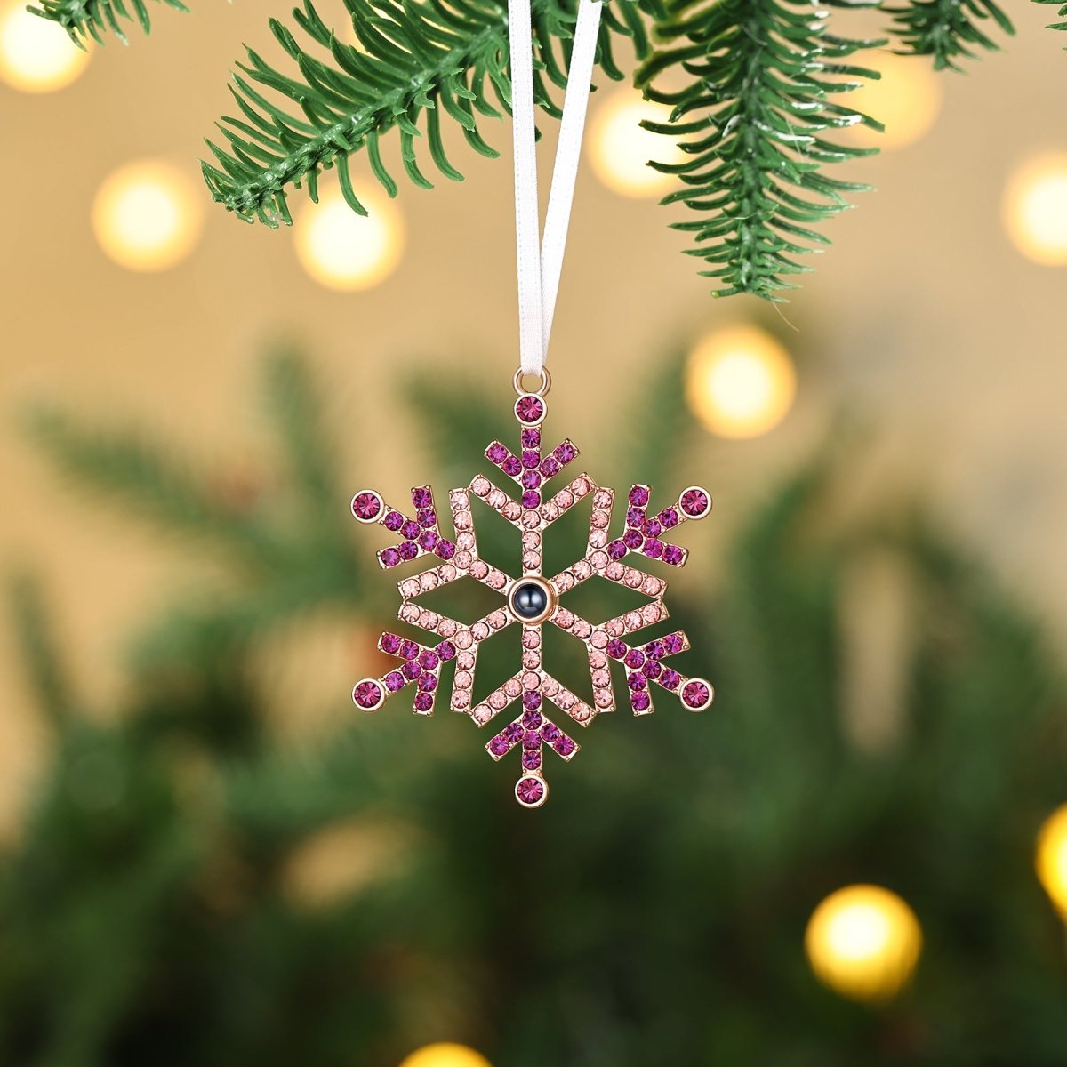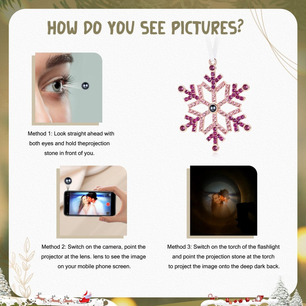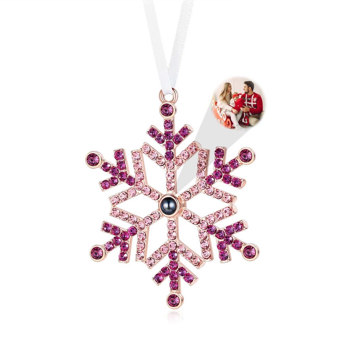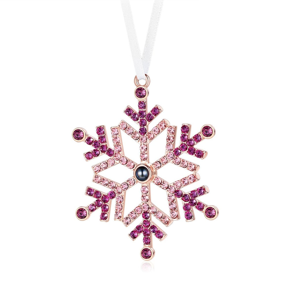 This stunning personalised photo projection Christmas ornament combines festive sparkle with cutting-edge technology. Designed as an elegant snowflake adorned with pink and rose-toned crystals, this unique tree decoration conceals a special surprise—a custom photo that projects when light shines through the central lens.
