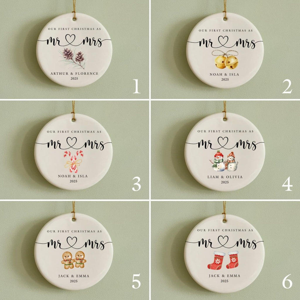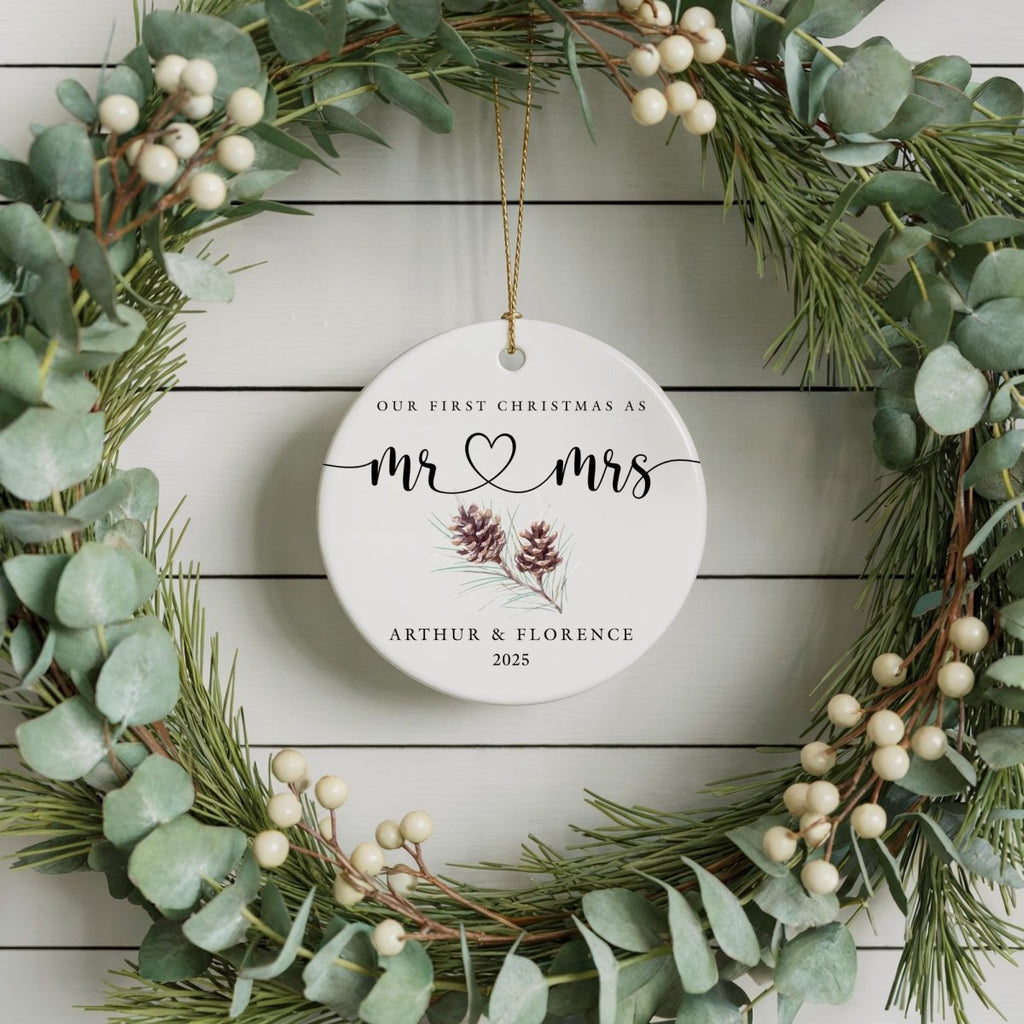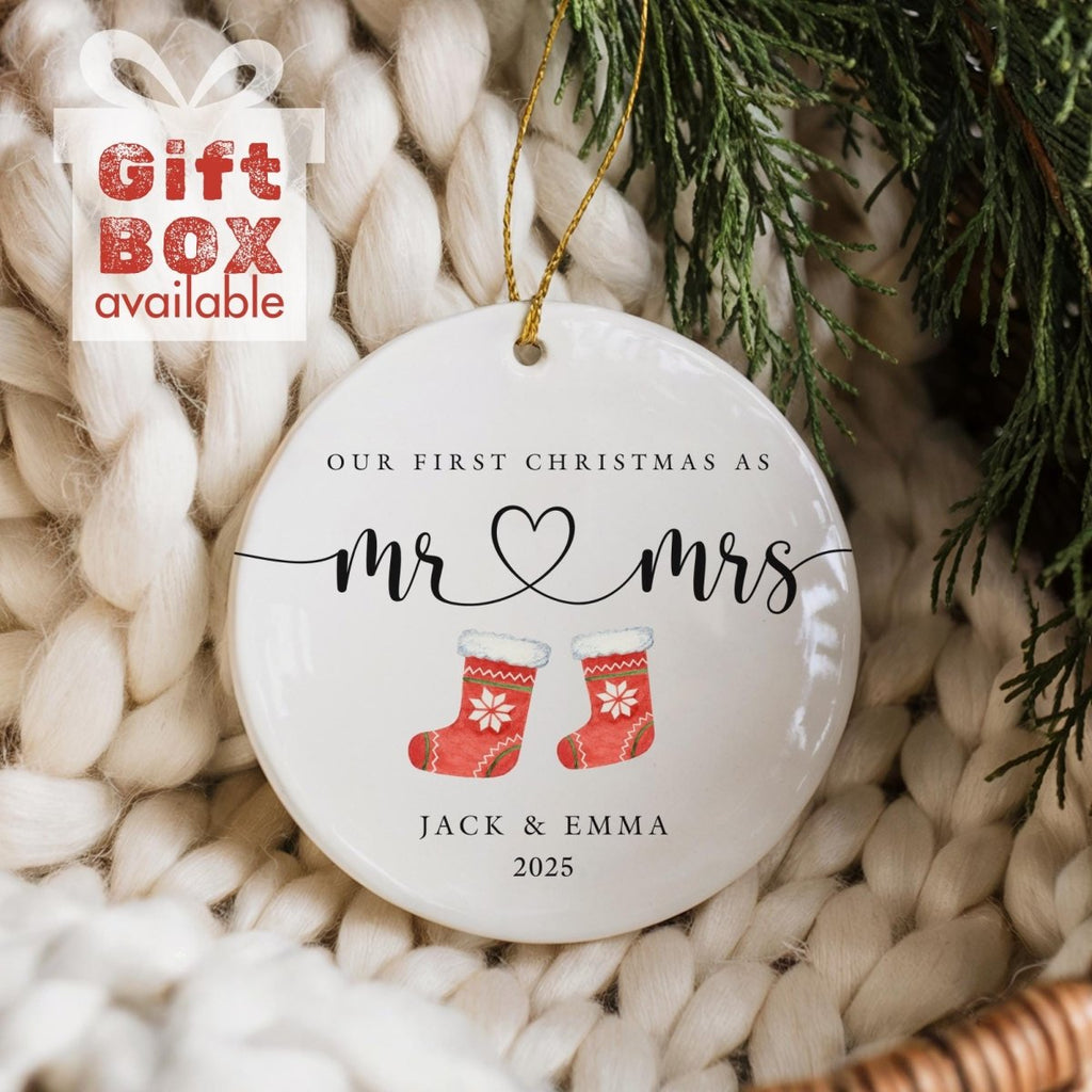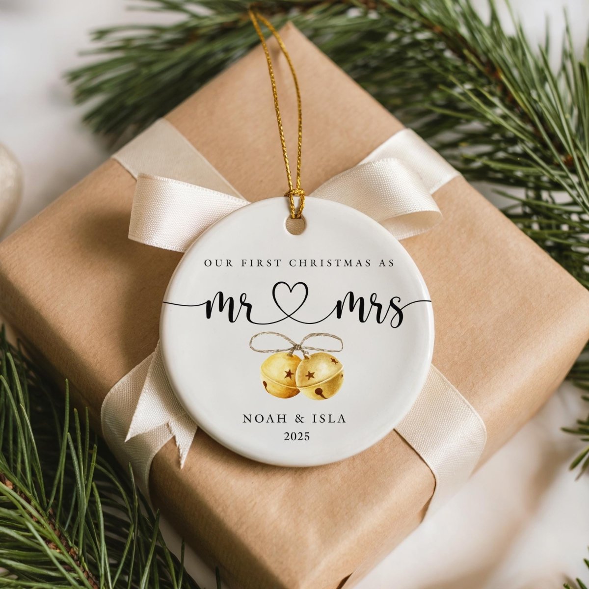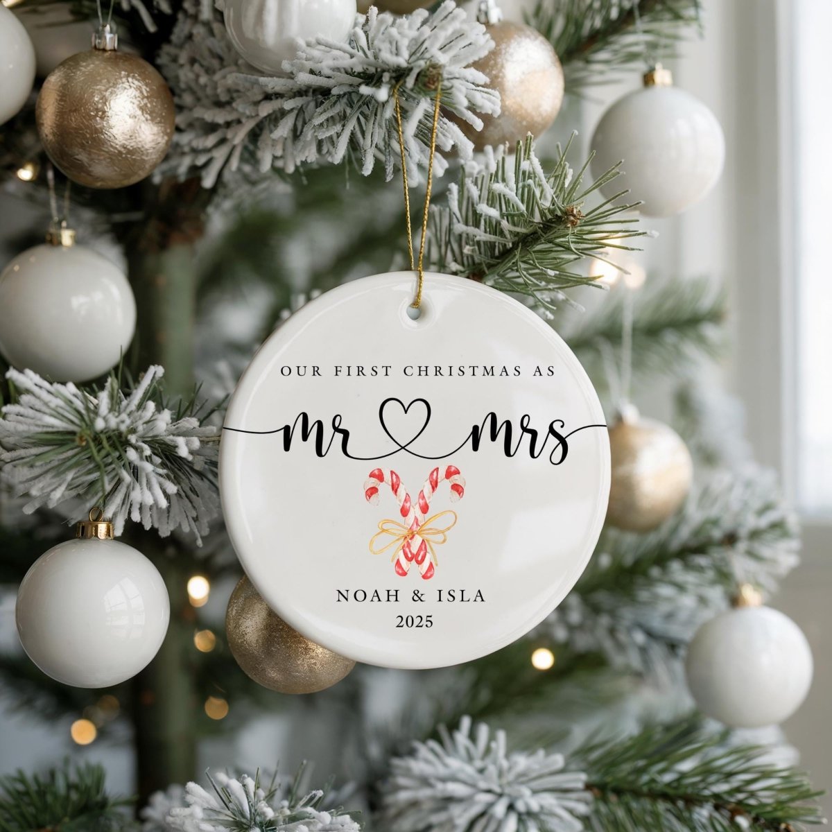 Celebrate your love with this first Christmas ornament, a personalised ceramic ornament designed to mark your first holiday together as a married couple. This custom Christmas bauble features elegant script personalization of your names and the year, making it a treasured married couple keepsake that captures the magic of your new life together. Crafted from premium high-gloss white ceramic, this festive ceramic keepsake shines beautifully on your holiday tree and serves as a commemorative Christmas ornament you will cherish for years.