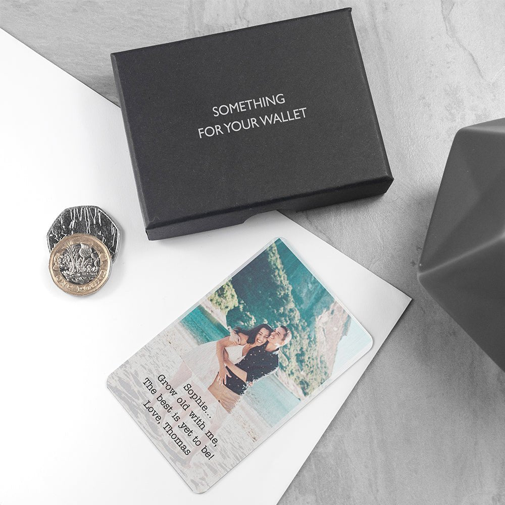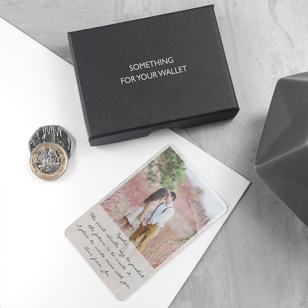 It comes presented in a sleek black gift box to showcase this stunning wallet keepsake in all its beauty. This silver-coloured metal keepsake will come with your image above a personalised message in black text in your choice of font.