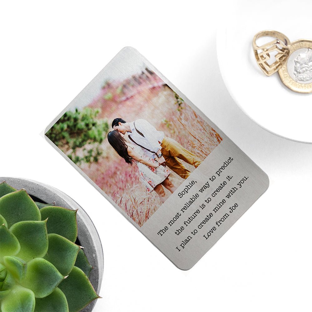 Add a special photo using the easy upload function on our website. Additionally you can personalise the image with a heartfelt message to add a personal touch to this charming wallet keepsake. Our team will engrave it onto your metal wallet keepsake for you to the highest standard, creating a premium quality gift your loved one will treasure.