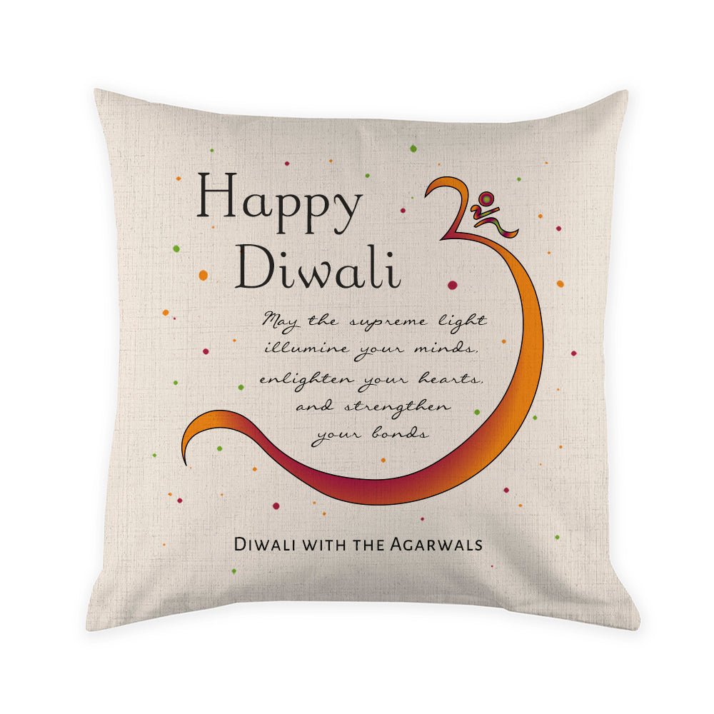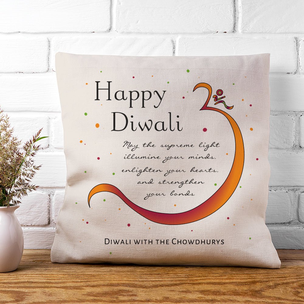 Looking for a beautiful and thoughtful Diwali gift? Look no further than our stunning personalised Diwali om symbol cushion cover. Perfect for adding a touch of festive cheer to your home, it’d make a stunning gift for a loved one, to show them how much they mean to you, or as a gorgeous Diwali decoration for your family’s home. Personalised with your family’s surname - so everyone knows whose house they are celebrating the Festival of Lights in - to create a unique and memorable gift that the recipient is sure to treasure forever. This design features a vibrant and colourful elongated Om symbol - inside which the inspirational spiritual text ‘Happy Diwali. May the supreme light illuminate your minds, enlighten your hearts and strengthen your bonds’ comes as standard. Surname: Up to 15 characters Dimensions: 40cm x 40cm Made from linen.