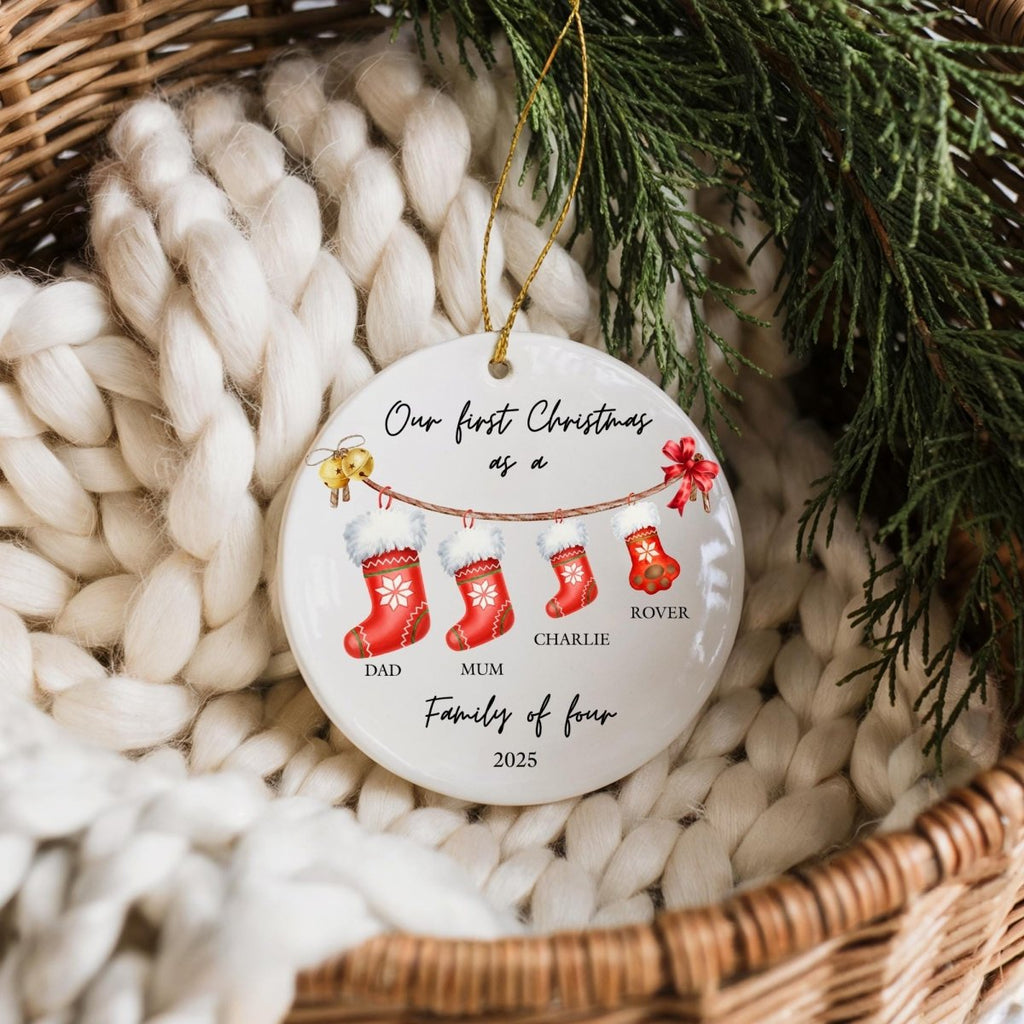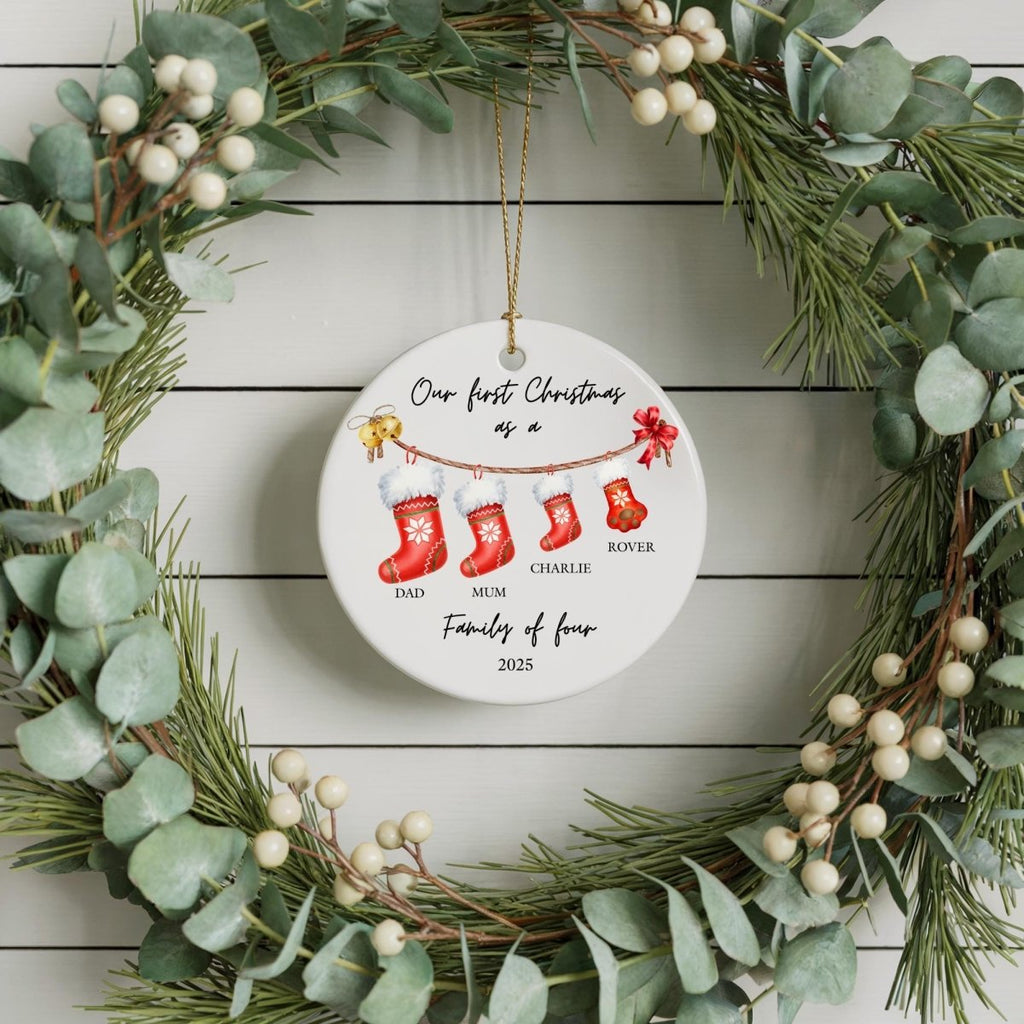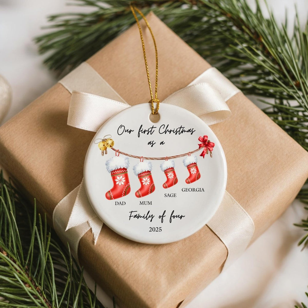Personalised Christmas Ornament – Family Of Four Ceramic Xmas Bauble With Custom Stockings