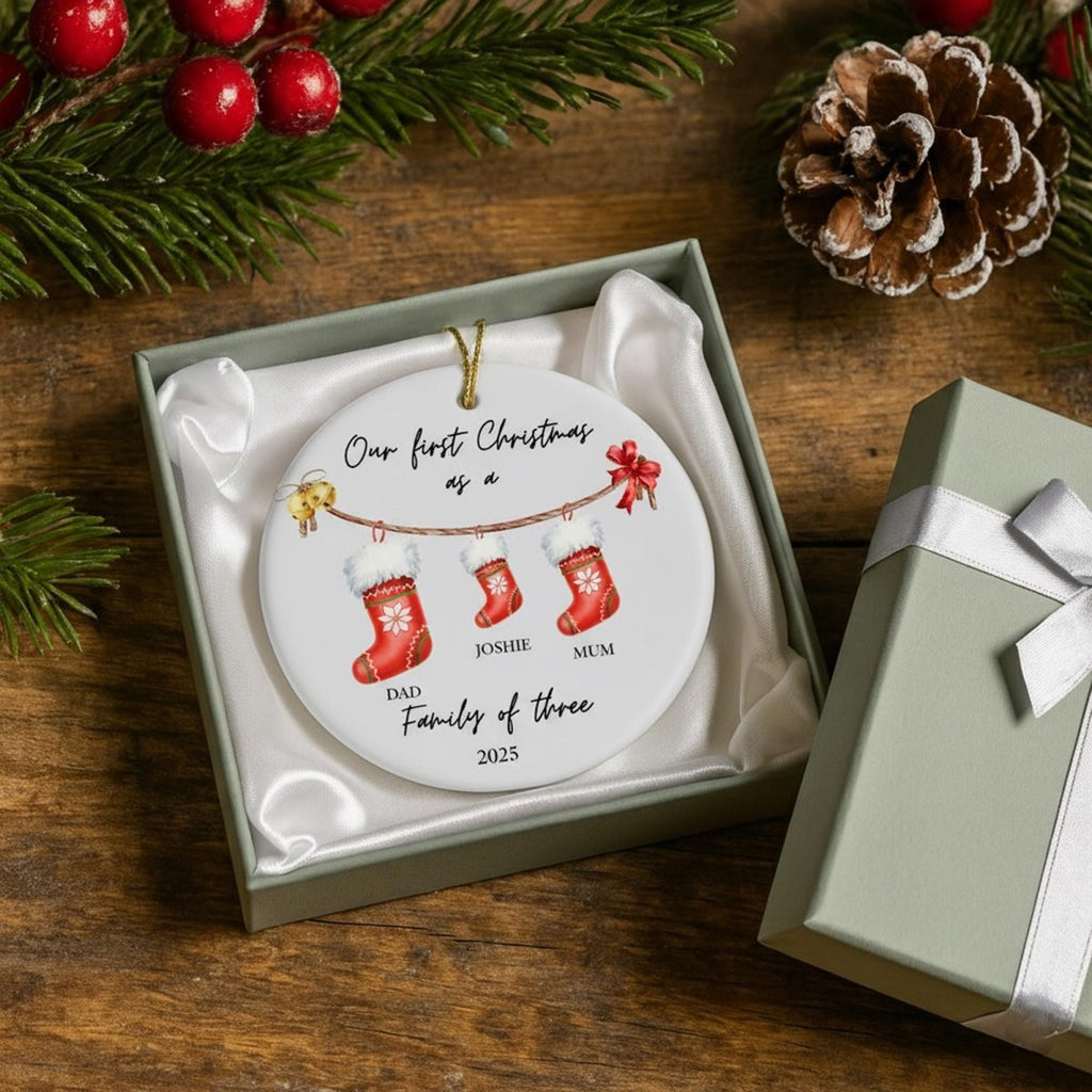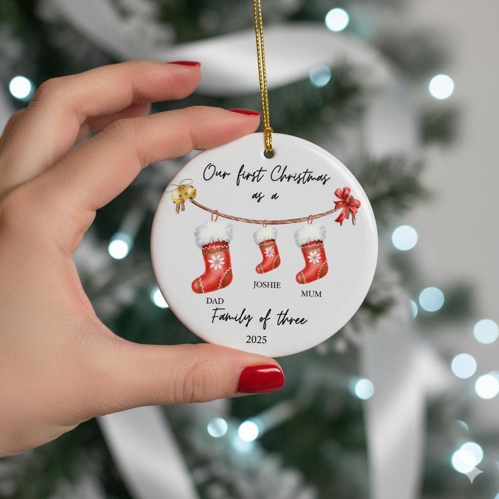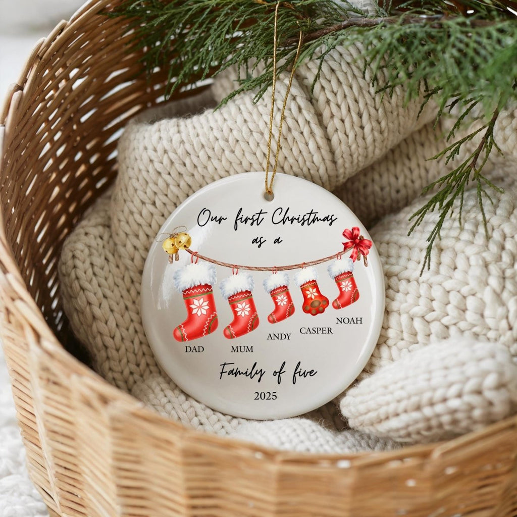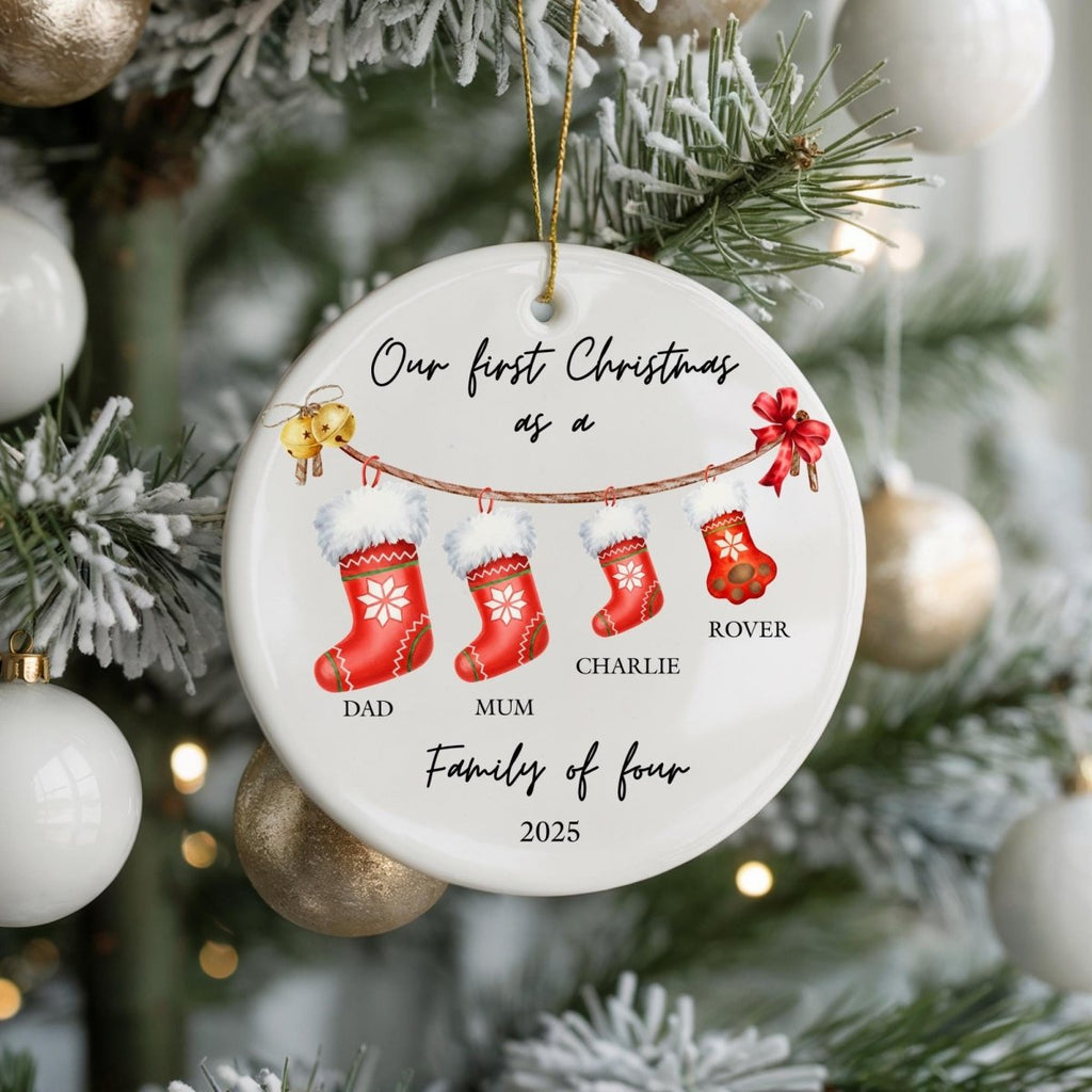 This personalised Christmas ornament is the perfect way to celebrate your family’s unique holiday story. Designed for families of any size, including pets and new babies, this ceramic Xmas bauble creates a lasting memory as a custom stocking ornament that captures your first Christmas together. Crafted from premium white ceramic with a glossy finish, this 7.5cm (3-inch) diameter holiday tree ornament features professionally printed names and stockings, making it an ideal baby first Christmas gift or pet stocking decoration.