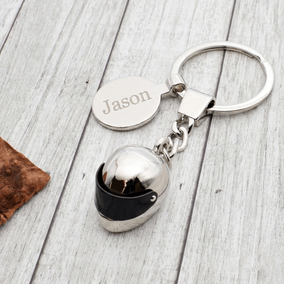 A thoughtful and meaningful gift for motorcyclists, this personalised keyring features a detailed miniature motorcycle helmet charm paired with an engraved coin carrying a heartfelt message.